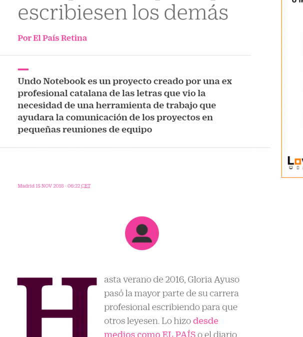 El diario El País a dedicado a Undo Notebook un reportaje en su sección sobre innovación y talento, Retina. El artículo lleva por título La periodista que creó una pizarra transportable para que escribiesen los demás, y explica la experiencia profesional de la fundadora de Undo Notebook, Glòria Ayuso, y cómo la necesidad de una herramienta útil en el trabajo y “las ganas de profundizar en lo de montar un proyecto propio” le llevó en 2016 a crear esta innovadora libreta ecofriendly.